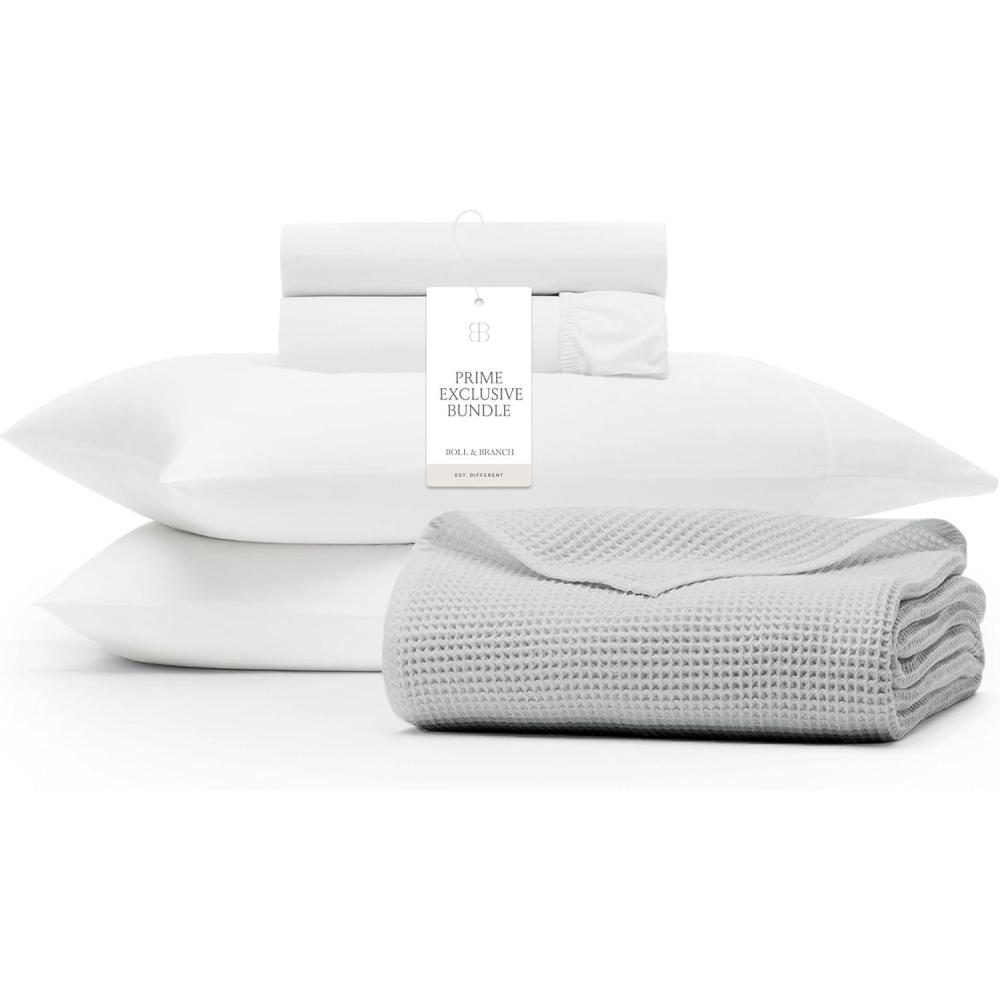 BOLL & BRANCH Waffle & Signature Prime Exclusive Bundle – 1 Sheet Set, White, Queen – 1 Waffle Blanket, Shore, Full, Queen- 100% Organic Luxury Cotton